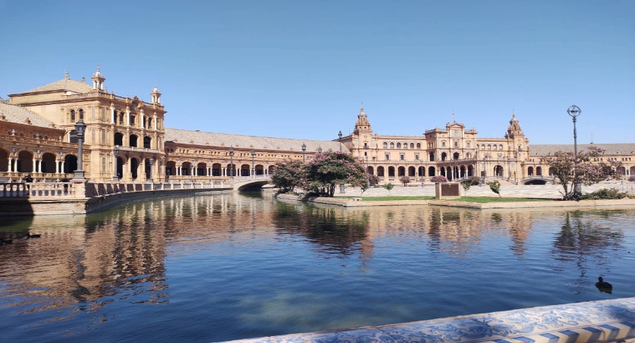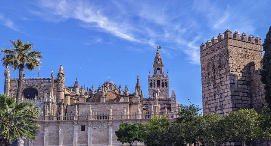 Este ângulo destaca a riqueza arquitetônica e os detalhes ornamentais da Catedral de Sevilha, reforçando sua importância como patrimônio mundial e símbolo do passado cristão e mouro da cidade.