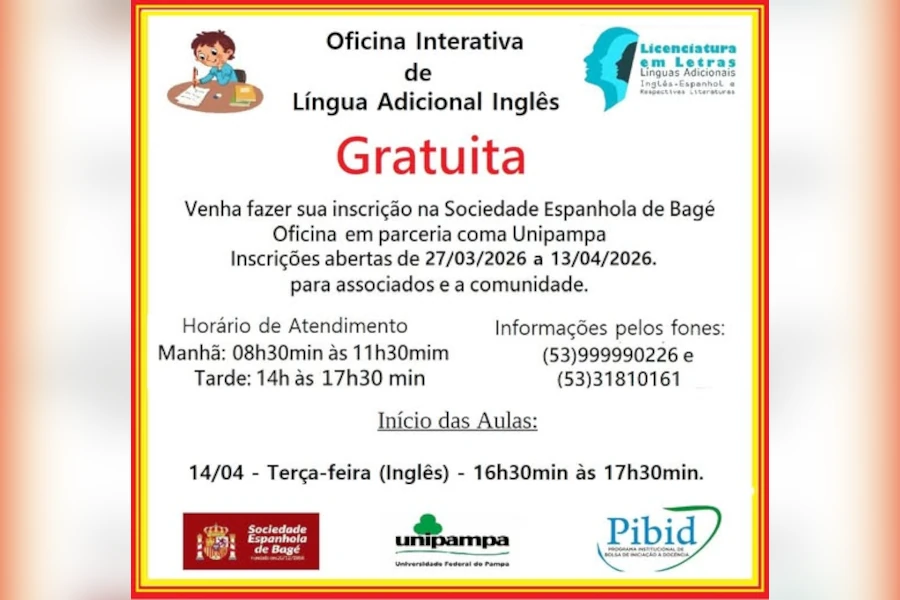 Estão abertas as inscrições para a Oficina Interativa de Língua Adicional Inglês! Esta é uma iniciativa totalmente gratuita voltada para associados e toda a comunidade de Bagé que deseja aprender de forma dinâmica.